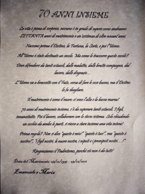 Mio Nonno e mia Nonna, rispettivamente di 91 e 90 anni, festeggiano il loro S E T T A N T E S I M O (70) anniversario di MATRIMONIO, e lo fanno scrivendo una lettera, riportata qui sotto, un vademecum di felicità condivisa, il testamento epistolare che noi nipoti abbiamo trascritto su pergamena e distribuito a tutta la nostra famiglia. SETTANTA, NOZZE DI FERRO come il loro legame anacronistico, indissolubile e, per questo, eterno: