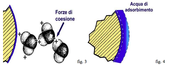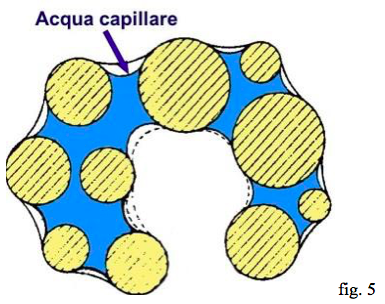 se accanto ad essa si trova a breve distanza una seconda particella, le forze di coesione e adesione (fig. 3 e 1) daranno origine, nel poro originatosi, al fenomeno della capillarità (fig. 5). La capillarità fa si che le forze di attrazione tra acqua e particella terrosa saranno tanto più elevate quanto più sono ridotte le dimensione dei pori e al diminuire del contenuto idrico.