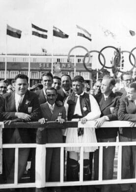 Der Olympiasieger im Marathonlauf von 1896, Spiridon Louis, mit griechischen Olympiakämpfern in Erwartung des Prinzen Paul.
