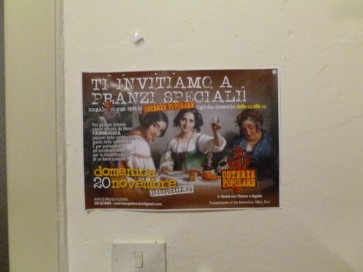 All’ora di pranzo, due volte al mese, è possibile fermarsi nell’osteria popolare, in un clima di grande allegria e cordialità, assaporando cibi sani, preparati da volontari che provano il piacere di cucinare per gli altri. Vengono gioiosamente coinvolte nel lavoro, bambine, figlie dei responsabili, per educarle da piccole al valore della solidarietà. Non per sfruttarle, come si verifica, per colpa della globalizzazione selvaggia e del WTO, l’Organizzazione Mondiale del Commercio, in molte realtà economiche di altre parti del mondo, i cui prodotti rimpinzano dispense e scaffali dell’occidente civilizzato!