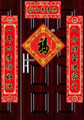 Un’altro aspetto importante dei preparativi per la festa, è la decorazione della casa, in particolare del portone d’ingresso, che deve essere addobbato con festoni di colore rosso recanti scritte di buon auspicio e con l’immancabile carattere “福”(fu), che vuol dire fortuna, felicità, e che a volte viene attaccato al contrario, a indicare che la fortuna proviene dal cielo.