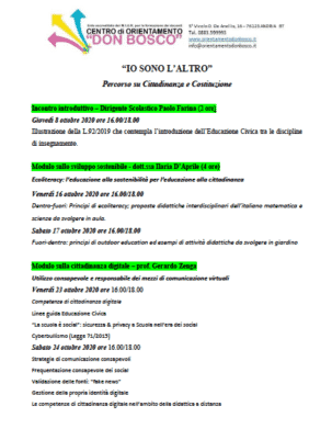 Il percorso formativo “Io sono l’altro”, che il Centro don Bosco ha elaborato e che inizierà, secondo la modalità a distanza, l’8 ottobre, intende presentare ai docenti una pluralità di sollecitazioni e di proposte laboratoriali per costruire un percorso di educazione civica.