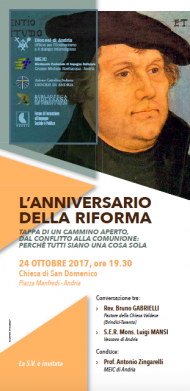 Data la significativa della prossima ricorrenza, il MEIC (Movimento ecclesiale di impegno culturale ), in collaborazione l’Ufficio Diocesano per l’Ecumenismo e il dialogo interreligioso, l’Azione Cattolica,,la Biblioteca diocesana “San Tommaso D’Aquino” ed il Forum di Formazione all’impegno sociale e politico hanno organizzato un incontro ecumenico- conversazione con l’intervento del Pastore Dr. Bruno Gabrielli (Pastore della chiesa valdese di Taranto, Brindisi, Grottaglie e diaspora) e il nostro Vescovo Mons. Luigi Mansi.