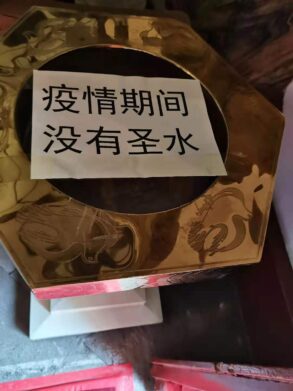 Noto subito che l’acquasantiera è vuota (la scritta in cinese nella fotto recita: “Niente Acqua Santa durante l’epidemia”), e tutti indossano la mascherina, a parte chi officia la messa, ovviamente.