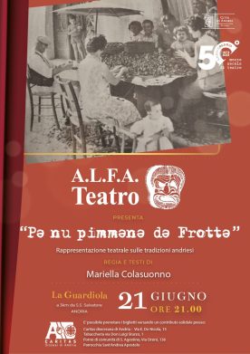 Portata in scena il 21 giugno presso “La Guardiola” di Andria, la commedia in vernacolo “P nu pimn d frott”, presentata dal Teatro A.L.F.A., si basa sul testo e sulla regia di Mariella Colasuonno, e rappresenta un tentativo di recuperare storie, sogni, voci, parole cadute in disuso, suoni e canti di Piazza Bonghi, in un’Andria ormai dimenticata, dal banditore al ciabattino, con echi di guerra sullo sondo. A spiegarcelo è la stessa Mariella.