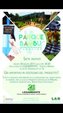 Si chiama Parquebambu ed è un parco giochi 100% naturale per la scuola primaria di Jerusalen de Miñaro, comunità di indios Nomatsiguenga della Selva Amazzonica peruviana. A raccontarlo giovedì 30 marzo alle h 20:30 durante l’aperitivo a cura del circolo Legambiente di Andria, il gruppo barese LAN_Laboratorio Architetture Naturali che firma il progetto insieme all’ associazione peruviana Semillas Para el Desarollo Sostenible. Non solo un parco giochi ma un progetto più ampio che parla di sostenibilità ambientale, partecipazione e co-progettazione, Parquebambu partirà dalla Puglia il prossimo 23 aprile per approdare in Perù fino all’8 maggio.