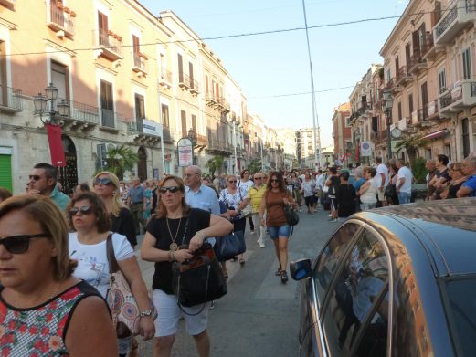 È protagonista, il popolo, questa mattina, mentre la luna, diafana, si attarda ancora alta nel cielo di Barletta, meticolosamente spazzata e lavata… nelle zone centrali, dagli operosi netturbini in tuta arancione con fascia catarifrangente grigia. Il popolo è già in piedi per testimoniare l’infiammato affetto per la sacra icona dello Sterpeto. Il popolo, sì, quello minuto, formato da gente semplice, senza grilli per la testa e con mille turbamenti quotidiani, animato da un forte e variegato sentimento del sacro. Soprattutto, donne anziane, e madri di famiglia che trascinano ancora, sonnolenti, i figli più grandicelli, e ragazze e giovanotti e uomini dai piedi titubanti.