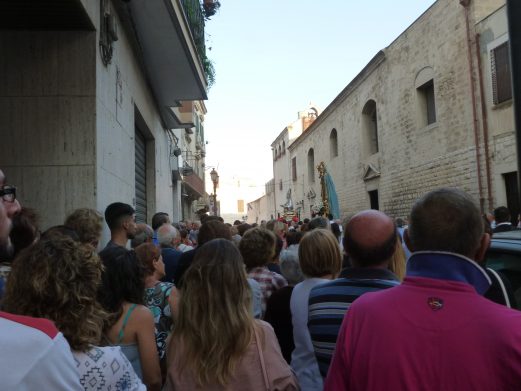 Subitaneamente si forma un corteo, che si muove con leggerezza verso il mare, accarezzando canzoni di adorazione per i Santi Patroni. Appare alquanto a disagio, di converso, il ramingo politico, incedente con fascia tricolore, raccattato tra i ranghi inferiori, a cui è toccato il compito di timbrare il cartellino, all’alba.