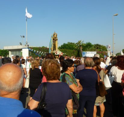 Arrivati all’altezza dell’azienda chimica “Timac”, la cui area è sottoposta a sequestro giudiziario preventivo, la statua viene portata verso l’ingresso. Si avverte l’impressione che la Madonna si turi il naso, punti i piedi, mostrandosi recalcitrante, e volga lo sguardo al cielo, per il disgusto, artigliando il blu con la scia bianca di un provvidenziale aereo in volo.
