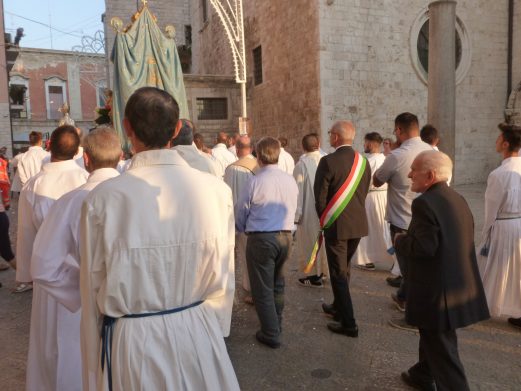 Tocca ancora, perciò, alla luna attuale vedere sfilare, nella processione patronale della domenica, una masnada di politici del territorio, sovente miscredente, agnostica, diversamente religiosa, priva di requisiti di onorabilità, capitanata in pompa magna dal sindaco in carica, bardato a tricolore, pavoneggiantesi, tronfia, con battutine, sorrisini, salutini o seriosi bronzei sguardi. Uno sfregio all’immacolato sentimento religioso della gente laboriosa ed onesta, una profanazione dei valori evangelici.