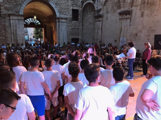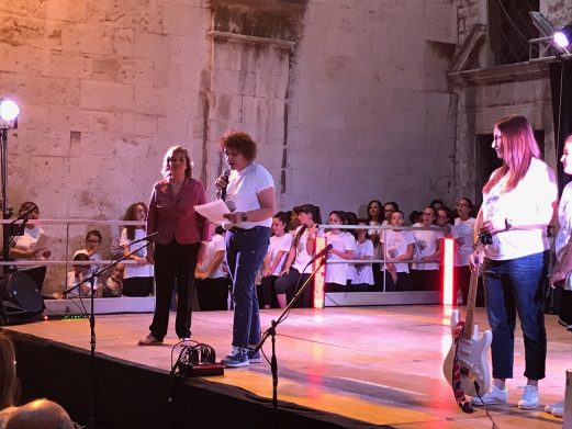 In terzo luogo, la scuola proponente: la “Imbriani/Salvemini” è una scuola di periferia, tanto che gli abitanti del quartiere san Valentino, dove la scuola è collocata, invece che dire “andiamo in centro città”, usano dire “andiamo ad Andria”… Bene, quella scuola, lo scorso 20 giugno, era al centro della città, nel cuore del suo centro storico, nel cortile del Palazzo Ducale, gremito per l’occasione, e ha regalato a tutti gli spettatori momenti di commozione vera e riflessione profonda.
